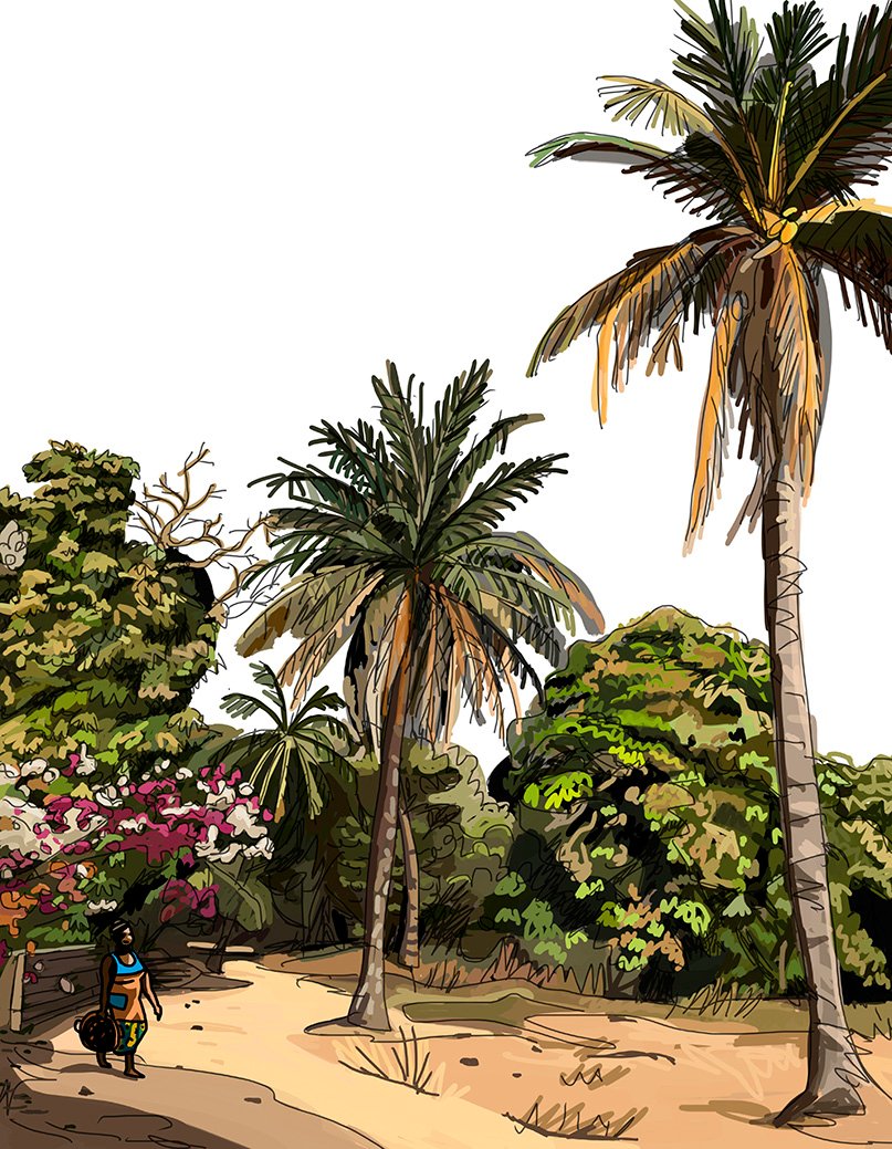 Ilustración de Javier Mariscal realizada en Thionck Essyl, en el viaje que hizo en marzo de 2017 a Casamance (Senegal) con Foundawtion. Tamaño 50x70 cm. 50 dibujos digitales impresos en papel William Turner, firmados y numerados por el autor.