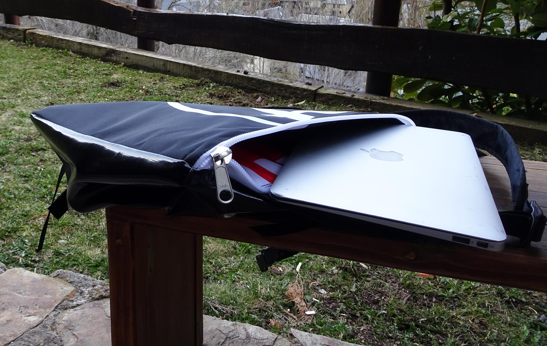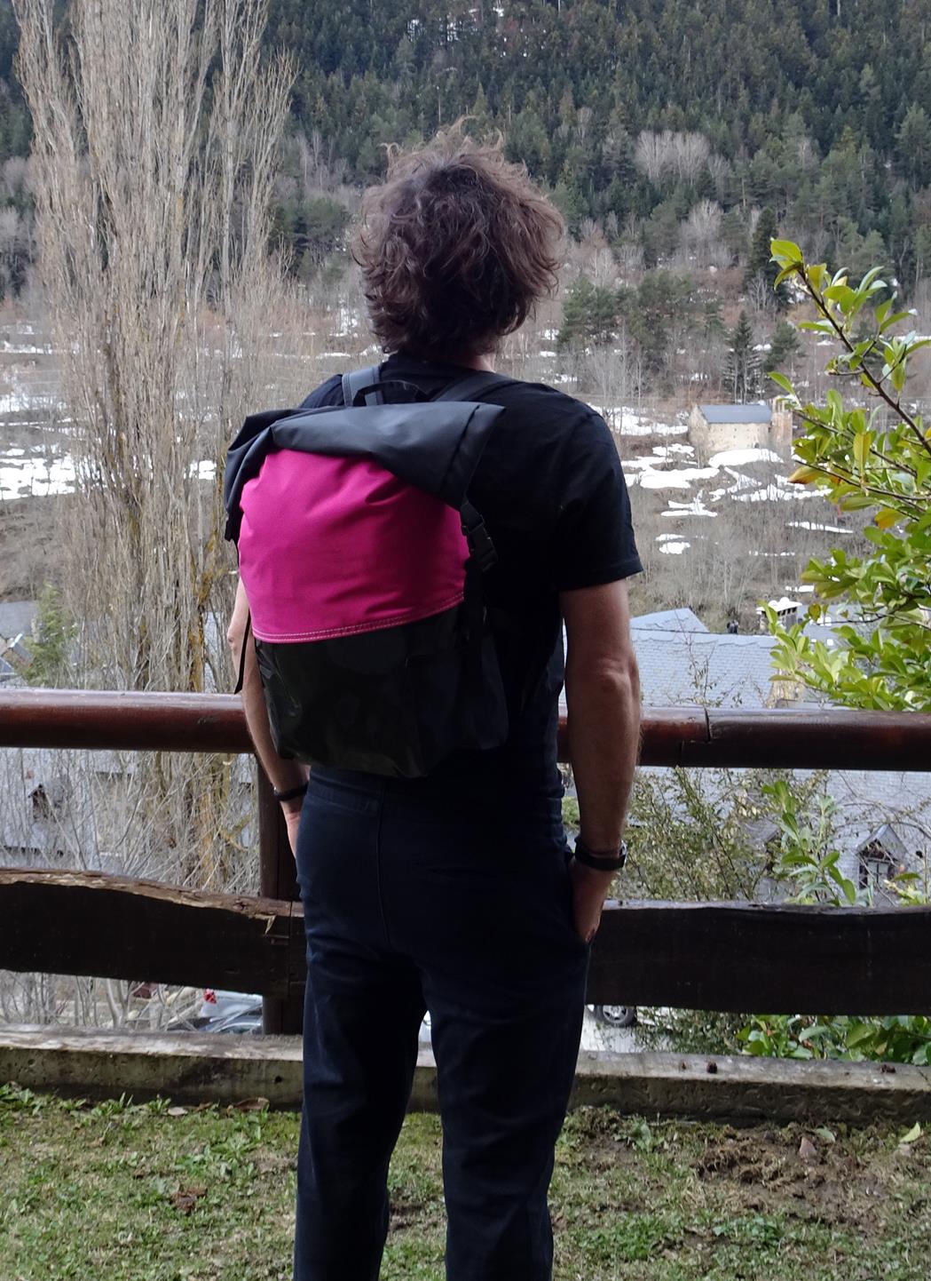 Mochila fabricada con materiales reciclados. Tiene diversos compartimentos, incluyendo uno para llevar tu ordenador portátil.